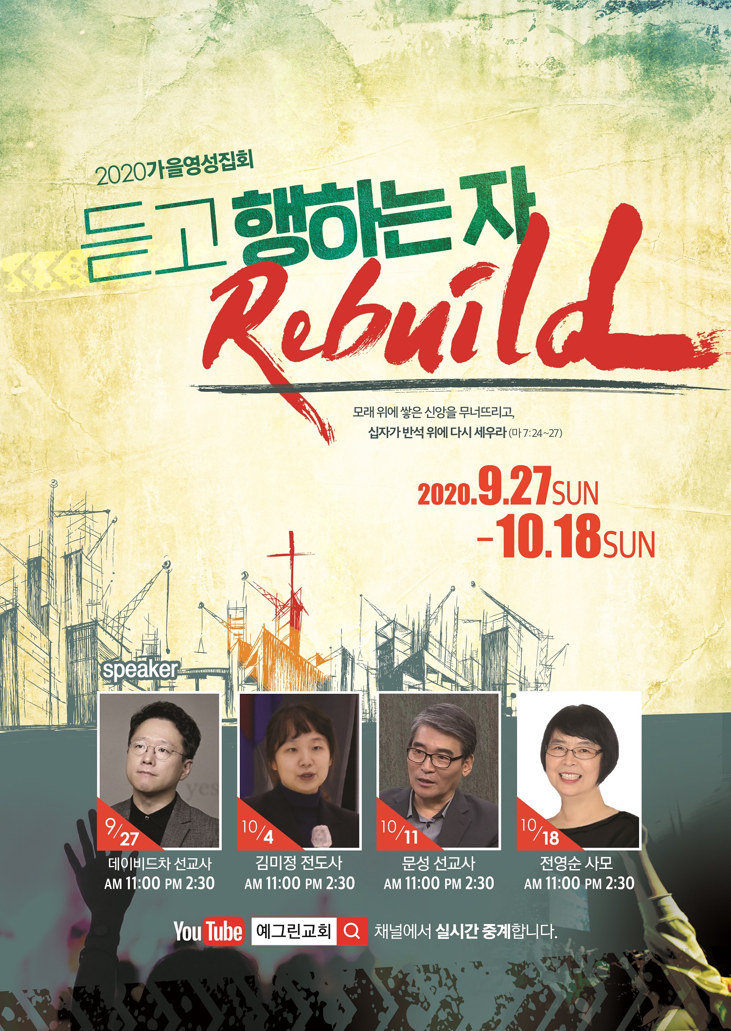 2020년 가을영성집회 주제: 듣고 행하는 자로 Rebuild!!(마7:24-27) 일시: 2020.09.20 ~ 10.11 오전11:00 / 오후2:30 장소: 예그린교회 본당 강사: 9월27일(주일): 데이비드차선교사(KAM선교회) 10월4일(주일): 김미정전도사(마가의다락방 기도원) 10월11일(주일): 문성선교사(파푸아뉴기니 선교사) 10월18일(주일): 전영순사모(한동대학교) *YouTube 로 실시간 참석 가능하십니다. "예그린교회" 채널로 들어오시면 되십니다. 현장에도 참여 가능합니다만, 좌석이 한정되어 있어, 전화로 미리 문의해주시면 감사하겠습니다. 교회 번호입니다. 032-561-0623 |
